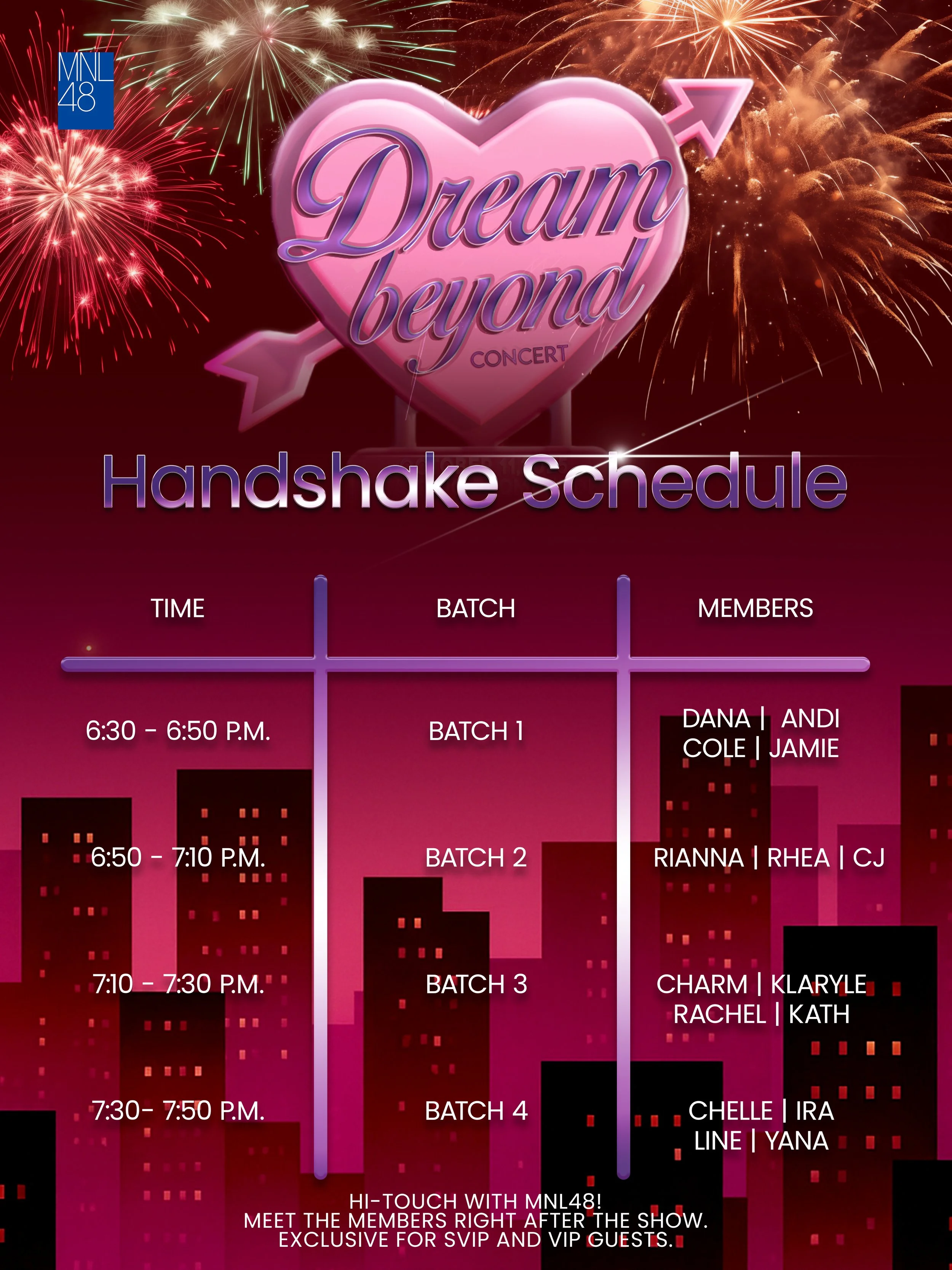 Start your Dream Beyond experience by meeting and greeting your favorite MNL48 members during the Handshake Event happening before the concert.